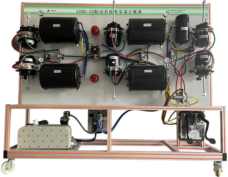 1.臺(tái)架上具有的全新天錦EQ1120GA原車零部件有空氣壓縮機(jī)總成、空氣干燥劑、前橋儲(chǔ)氣筒、后橋儲(chǔ)氣筒、手制動(dòng)儲(chǔ)氣筒、再生儲(chǔ)氣筒、輔助儲(chǔ)氣筒、四回路保護(hù)閥、制動(dòng)腳閥、駐車閥、ABS電磁閥、繼動(dòng)閥、制動(dòng)管路、氣壓表若干個(gè)。