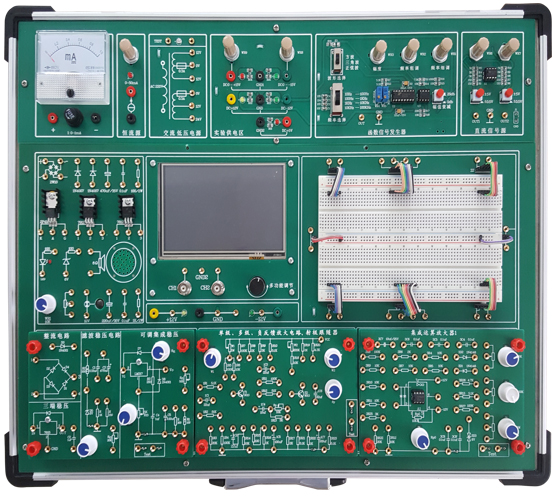 含機(jī)箱、工作電源、常用模擬信號(hào)源、實(shí)驗(yàn)電路區(qū)和分立元件和測量儀器等 |