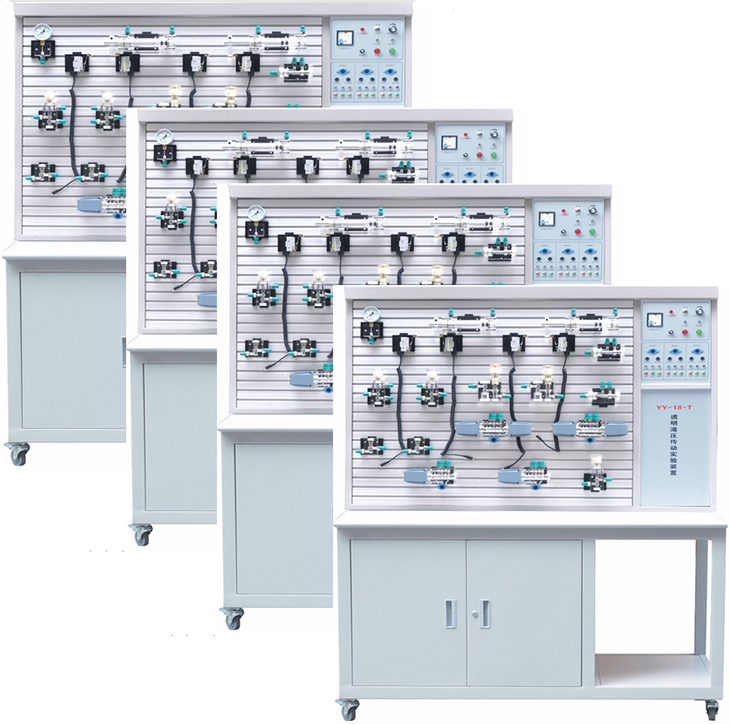 透明液壓實(shí)驗(yàn)臺為實(shí)現(xiàn)液壓傳動課程現(xiàn)代化教學(xué)而進(jìn)行研究的最新科技成果,它填補(bǔ)了技校、中專、大專院校的液壓傳動透明教學(xué)設(shè)備的國家空白。液壓傳動具有重量輕、功率大、結(jié)構(gòu)簡單、布局靈活、控制方便等特點(diǎn)、速度、扭矩、功率均可作無級調(diào)節(jié),能迅速換向和變速,調(diào)速范圍寬,快速性好,工作平穩(wěn)、噪音小,元器件已實(shí)現(xiàn)系列化、標(biāo)準(zhǔn)化,通用化等一系列優(yōu)點(diǎn),隨著科學(xué)技術(shù)的發(fā)展,液壓傳動作為一種可以傳遞動力和控制的傳動方式,已經(jīng)日益廣泛應(yīng)用到醫(yī)療、科技、軍事、工業(yè)自動化生產(chǎn)、起動、運(yùn)輸、礦山、建筑、航空等各個(gè)領(lǐng)域。為了適應(yīng)在短暫課堂時(shí)間內(nèi),完成多個(gè)液壓油路的教學(xué)內(nèi)容。同時(shí)對比演示多個(gè)不同油路的工作原理。而且,使油路系統(tǒng)的安裝調(diào)試有必要的程序且不占用上課教學(xué)時(shí)間。就必須有多臺設(shè)備同時(shí)工作。同時(shí),YY-18