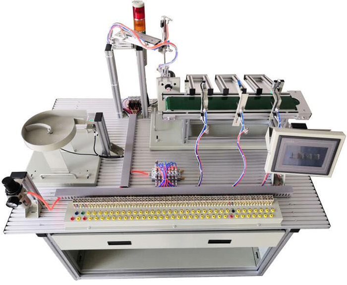 基于PLC的機(jī)電一體化實訓(xùn)設(shè)備,歐姆龍PLC為基礎(chǔ),一個觸摸屏,具備各種按鈕,指示燈,傳感器,一套電機(jī),一套氣缸,具備插接板,可快速搭接線路,模擬實訓(xùn)多個典型工業(yè)自動化控制應(yīng)用場景