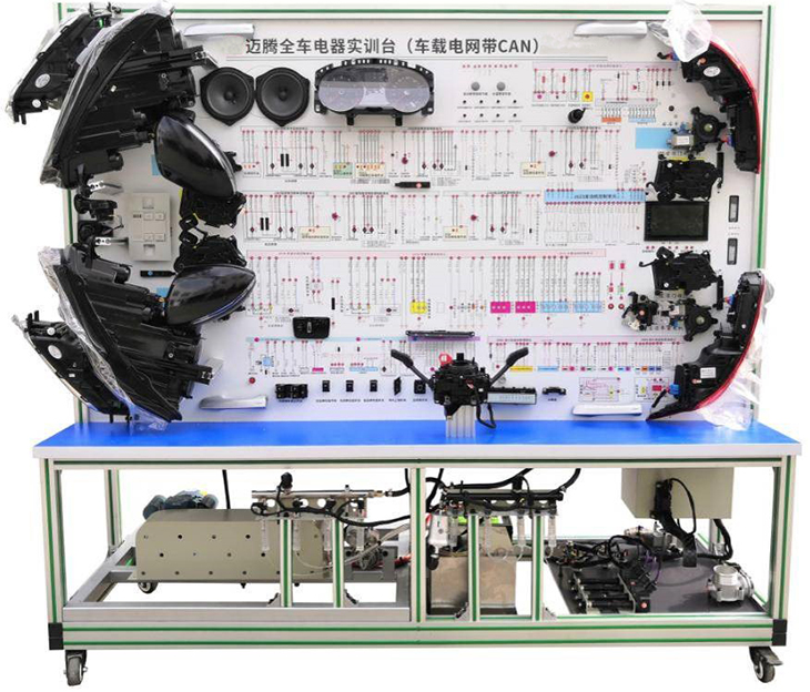 2.設(shè)備面板采用耐創(chuàng)擊、耐污染、防火、防潮的高級(jí)鋁塑板,表面經(jīng)特殊工藝噴涂底漆處理;面板打印有永不褪色的彩色電路圖;學(xué)員可直觀對(duì)照電路圖和實(shí)物,認(rèn)識(shí)和分析汽車整車電器各系統(tǒng)的工作原理。