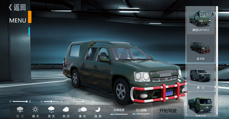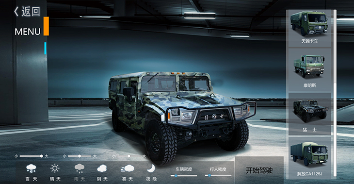 7.1、仿真車模型:10 種典型虛擬車輛模型:東風猛士、北汽勇士、 EQ1118、EQ1121、 EQ2102、SX2150、SX2190、豪濼 ZZ2197、東風天錦、大客車等,并可根據(jù)需要拓展、定制個 性化車輛模型。