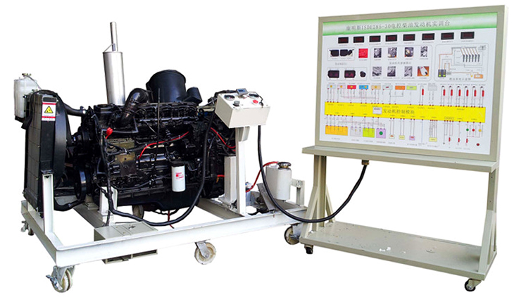 柴油發(fā)動(dòng)機(jī)總成、組合儀表、發(fā)動(dòng)機(jī)控制單元、散熱系統(tǒng)(水箱、風(fēng)扇、上下水管)、排氣系統(tǒng)、進(jìn)氣系統(tǒng)(進(jìn)氣軟管、空氣濾清器總成)、原車電路原理圖板及檢測端子面板、蓄電池、電源總開關(guān)、燃油箱、油水分離器、油門踏板裝置、可移動(dòng)機(jī)臺(tái)架、臺(tái)架高溫及轉(zhuǎn)動(dòng)等部位加裝防護(hù)裝置等。